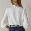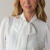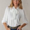 Camisa de manga larga color blanco. Cuello con lazada larga para anudar en la parte frontal. Puños con goma elástica fruncida para un ajuste cómodo. Es de corte recto y fluido.