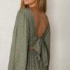Vestido largo color verde con diseño floral. Es de escote cuadrado y mangas largas. La espalda tiene lazada ajustable. La cintura es elástica para mejor ajuste a la silueta.