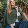 Capa de color verde con cuello camisero con botón. Detalle de botones en cada hombro. Diseño cruzado en la parte frontal y corte amplio con caída fluida.
