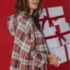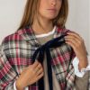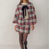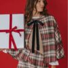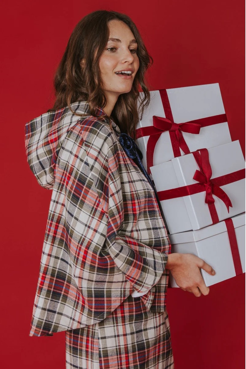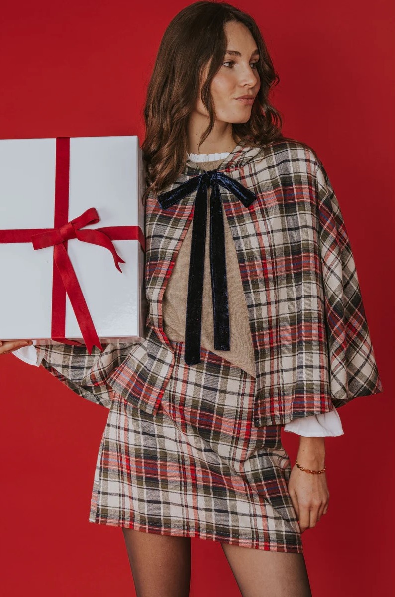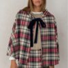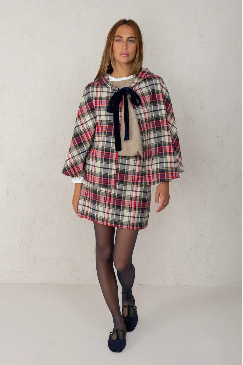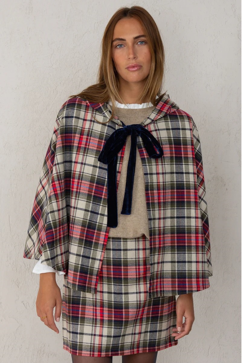 La prenda es una capa de tejido de cuadros escoceses en tonos crema, rojo y azul marino. Tiene una capucha y un lazo ancho de terciopelo azul marino que se ata en la parte frontal.