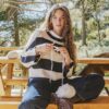 Jersey con franjas anchas horizontales en azul marino y beige. Es de corte recto y holgado. Tiene cuello redondo. hombros caídos y las mangas largas.