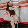 Pantalón estampado digital de diseño floral color rojo. Es de tiro alto y corte recto. En el frente tiene botón y cremallera a modo de cierre. La cintura tiene trabillas para cinturón y en la parte posterior tiene dos bolsillos.